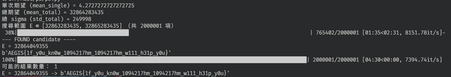 先計算單次期望與變異數,得到 mean_total 與 std_total;在 mean_total ± R 的範圍內窄幅暴力搜尋候選 E。對每個 E 計算 a = 11^E mod p,取 a 的模逆 a^{-1},然後 flag_long = c * a^{-1} mod p,再轉成 bytes 並檢查是否像可讀 flag 。